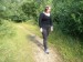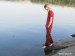 The girl strolls in a muddy puddle, where she also sits. Then she goes for a swim in a lake. When she leaves the water she takes off her shoes and socks, pour the water out from the shoes and wrings the socks.