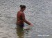 The girl comes into a river below the weir. She strolls in the shallow water and gradually goes into greater depth. When the water is waist-high she goes out and strolls above the weir. After that she goes into even greater depth where she swims. Then she sits on the top of the weir. She takes off her jacket and goes into the water in her sweatshirt. She swims and dives so her hair is also wet. When she gets out of the water she takes off her shoes, grabs them along with her jacket, and leaves