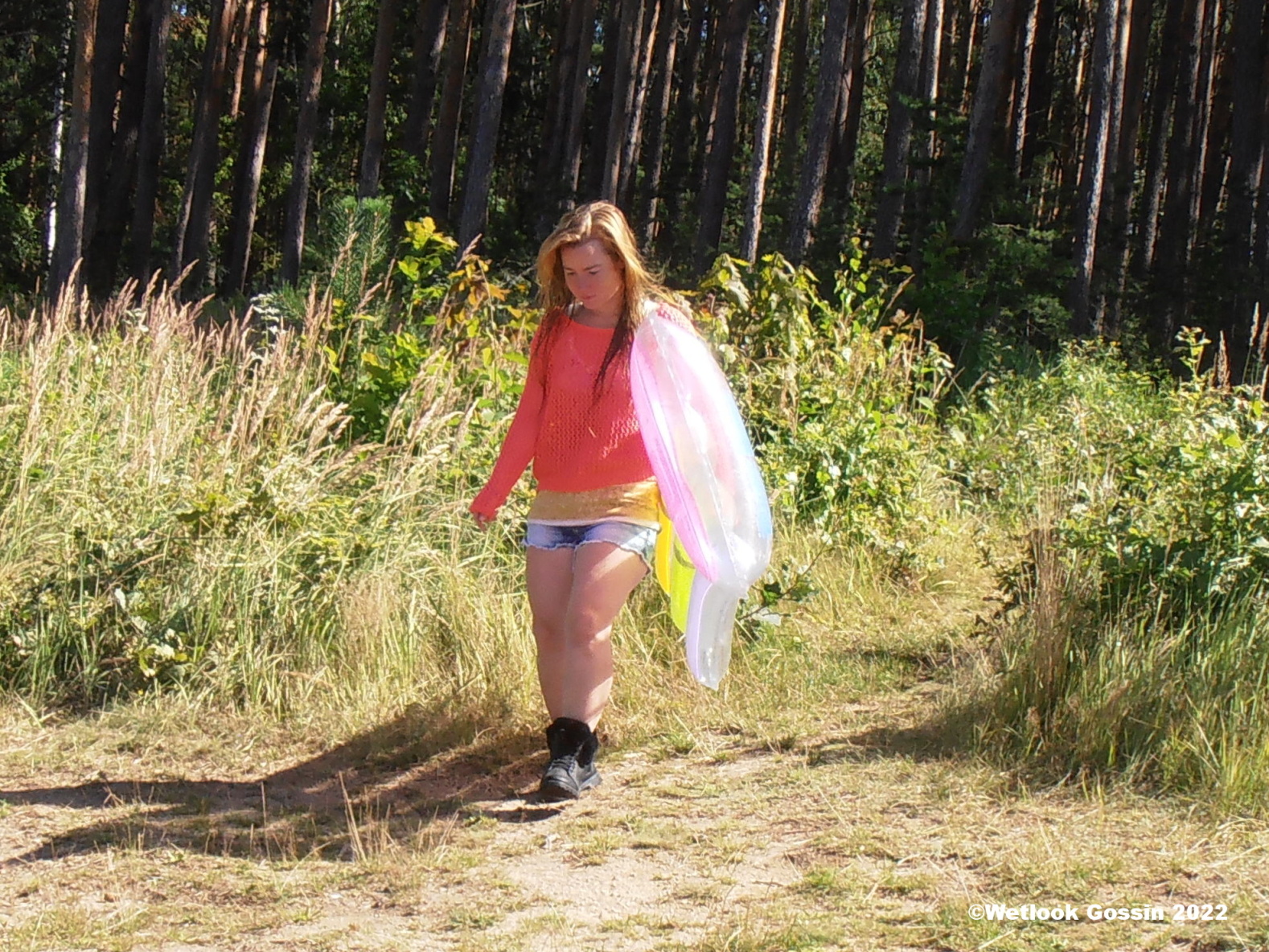 The girl strolls in a muddy puddle, where she also sits. Then she goes for a swim in a lake. When she leaves the water she takes off her shoes and socks, pour the water out from the shoes and wrings the socks.